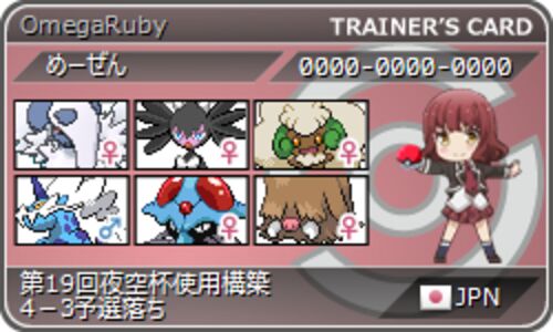 こんにちは くろばさん主催の第19回夜空杯に参加しました。 今回もスタッフとしての参加でした。 今回はどんな構築を組もうかなと考えていた時、夜空杯の運営であるくろばさんとしんめーさんが以前使用し、いい結果を残すことが出来なかったメガアブソルを軸…